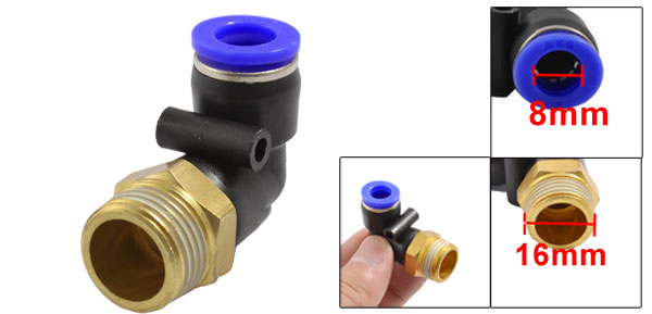 Item Name Quick Fittings Overall Size 39 x 29 x 19mm/ 1.5" x 1.1" x 0.75"(L*W*T) Inner Diameter (Blue End) 8mm/0.31“ Thread Diameter 16mm/ 0.63" Material Brass, Plastic Color Black, Gold Tone, Blue Weight 21g Package Content 1 x Quick Fittings - Reviews