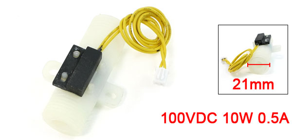 Product Name Water Flow Switch Voltage&Current 100VDC 10W 0.5A Male Thread Diameter 21mm/ 0.79" Inner Hole Diameter 8mm/ 0.31" Total Length 60mm/ 2.3" Cable Length 30cm/ 11" Material Plastic, Metal Color White Weight 21g Package Content 1 x Water Flow Switch - Reviews