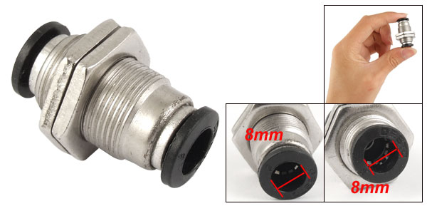 Details8mm OD Tube Full Port Pneumatic Fitting Quick Connector  Product Name Pneumatic Fitting Design Full Port Total Size 32 x 27mm/1.3'' x1.1'' (L*Max.D) Fit Tube Outer Diameter 8mm/0.31'' Thread Diameter 16mm/0.63'' Material Plastic, Metal Color Silver Tone, Black Weight 27g Package Content 1 x Pneumatic Fitting