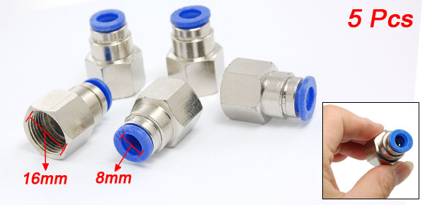 Item Name Quick Fittings Total Size 30 x 22mm/1.2" x 0.9"(L*W) Thread Diameter 16mm/0.629" Inner Diameter (Blue End) 8mm/0.315" Material Chrome Plated Brass & Plastic Color Silver Tone, Blue Weight 148g Package Content 5 x Quick Fittings - Reviews