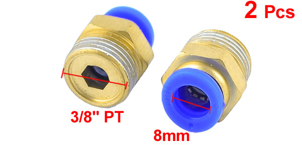 Details8mm x 3/8" PT Threaded Pneumatic Straight Quick Joint Connector Coupler 2pcs  Item Name Quick Coupler Overall Size 20 x 19mm/ 0.8" x 0.75"(L*W) Inner Diameter (Blue End) 8mm/ 0.31" Male Thread Size 3/8" PT Main Material Brass, Plastic Color Gold Tone, Blue Weight 31g Package Content 2 x Quick Coupler
