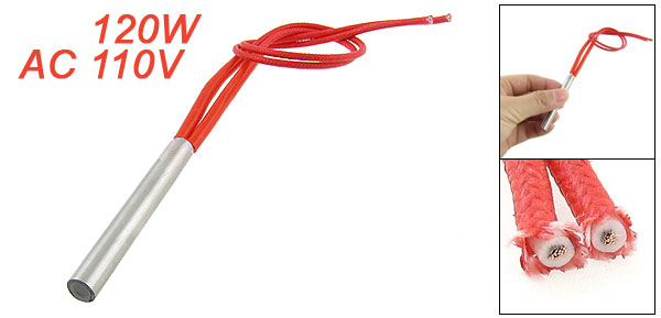 Product Name Cartridge Heater Material Stainless Steel, PVC, Nylon Rated Voltage AC 110V Power 120W Heater Size (Approx.) 8 x 60mm / 0.31" x 2.4" (D * L ) Wire Length (Approx.) 26cm / 10.2" Color Silver Tone, Red Weight 20g Package Content 1 x Cartridge Heater - Reviews