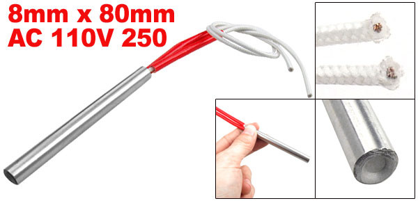 Details8mm x 80mm AC 110V 250 Watt Wired Cartridge Heater for Die Heating  Product Name Cartridge Heater Material Stainless Steel, PVC, Nylon Rated Voltage AC 110V Power 250W Heater Size (Approx.) 8 x 80mm/ 0.31'' x 3.1'' (D * L) Wire Length (Approx.) 260mm/ 10.2'' Color Red, White, Silver Tone Weight 26g Package Content 1 x Cartridge Heater