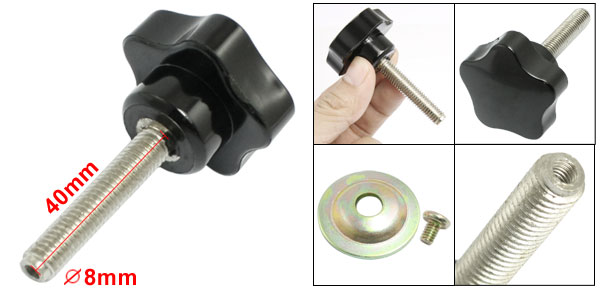 Product Name Star Knob Type Screw Type Head Size 38 x 38 x 24mm/ 1.5" x 1.5" x 0.9"(L*W*H) Thread Length 40mm / 1.6" Thread Diameter 8mm / 0.3" Total Length 65mm / 2.5" Material Metal, Plastic Main Color Black Weight 46g Package Content 1 x Star Knob