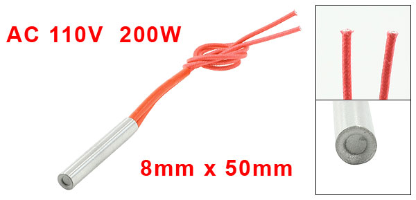 Product Name Cartridge Heater Material Stainless Steel, PVC, Nylon Rated Voltage AC 110V Power 200W Heater Size (Approx.) 8 x 50mm / 0.3" x2" (D * L ) Wire Length(Approx.) 26cm / 10.2" Color Silver Tone, Red Net Weight 20g Package Content 1 x Cartridge Heater - Reviews