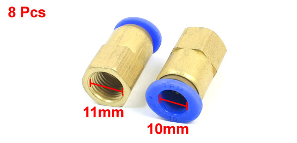 Item Name Quick Fitting Total Size 32 x 22mm/ 1.3" x 0.9" (L*Max.D) Female Thread Dia. 11mm/ 0.43" Push in Pipe Dia(Blue End) 10mm/ 0.4" Main Material Metal, Plastic Color Brass Tone, Blue Weight 182g Package Content 8 x Quick Fittings - Reviews