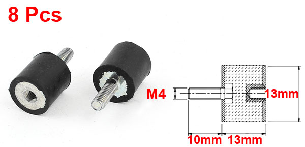 Product Name Rubber Vibration Mount Male Thread Size M4 x 10mm(Dia.*L) Female Thread Size M4 x 6mm(Dia.*L) Rubber Size 13 x 13mm /0.51" x 0.51" (Dia.*H) Material Metal, Rubber Color Black, Silver Tone Weight 44g Package Content 8Pcs x Rubber Vibration Mounts - Reviews