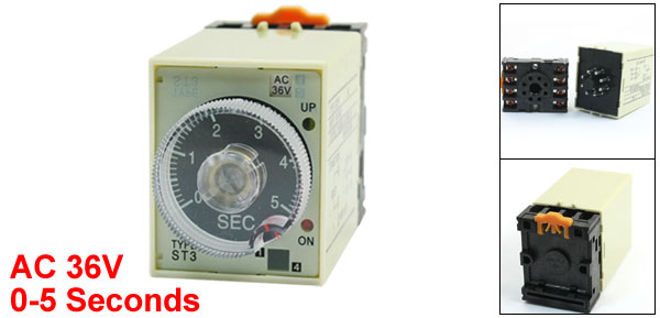 Product Name Timer Delay Relay Model Number ST3PF Pin Number 8 Pin Rating AC36V Contact Type 3A 250VAC Resistive Load Contact Type SPDT Time Range 0-5 Seconds Indicator Operation UP ON Two Indicator Lamps Socket Size 5.5 x 4.3 x 3cm/2.2"x 1.7" x 1.2“(L*W*T) Fixing Hole Dia 5mm/0.2" Hole Distance 50mm/2" Overall Size(Approx) 7 x 5 x 4cm/2.8" x 2" x 1.6"(L*W*H) External Material Plastic, Metal Net Weight 108g Package Content 1 x Timer Delay Relay w Socket
