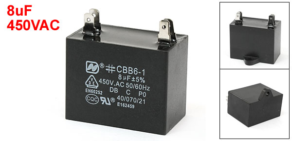 Product Name Motor Capacitor Housing Material Plastic Dielectric Material Polypropylene Film Model CBB6-1 Capacitance 8uF Tolerance ±5% Rated Voltage 450VAC Frequency 50/60Hz Pin Number 4 Overall Size(Pin Non Included) 4.8 x 3.8 x 2.8cm/1.9" x 1.5" x 1.1"(L*W*H) Mounting Hole Dia 4.5mm/0.18" Color Black Weight 61g Package Content 1 x Motor Capacitor - Reviews