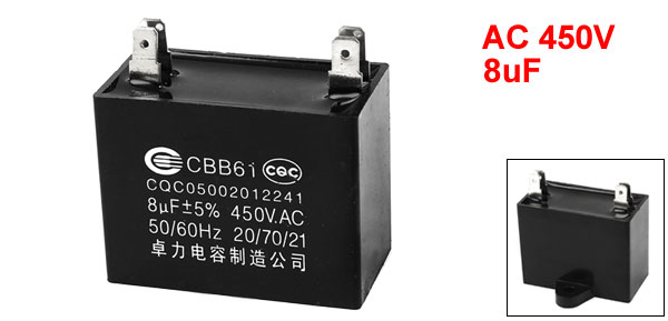 Product Name Motor Capacitor Housing Material Plastic Dielectric Material Metallized Polypropylene Film Model CBB61 Capacitance 8uF Tolerance +/-5% Rated Voltage AC 450V Frequency 50/60Hz Temperature 25/70/21 Overall Size 48 x 25 x 37mm/1.9" x 1.0" x 1.4"(L*W*H) Color Black Weight 53g Package Content 1 x Motor Capacitor - Reviews