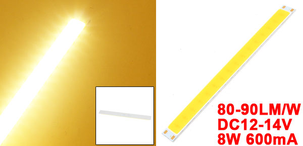 Product Name COB LED Lamp Beads Rated Voltage DC12-14V Luminous Flux 80-90LM/W Color Temperature 2800-3000K Power 8W Current 600mA Light Color Warm White Material Aluminum Color Silver Tone, Orange Size 140 x 13mm/ 5.5" x 0.51"(L*W) Luminous Surface 130 x 13mm/ 5.1 x 0.51"(L/W) Weight 6g Package Content 1 x COB LED Lamp Beads - Reviews