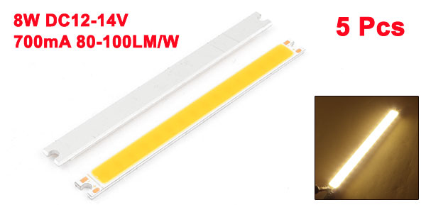 Product Name COB LED Lamp Beads Rated Voltage DC12-14V Luminous Flux 80-100LM/W Color Temperature 2800-3000K Power 8W Current 700mA Light Color Warm White Material Aluminum Color Silver Tone, Orange Size 100 x 7mm/ 3.9" x 0.28" (L*W) Luminous Surface 90 x 7mm/ 3.5" x 0.28"(L*W) Weight 27g Package Content 5 x COB LED Lamp Beads - Reviews