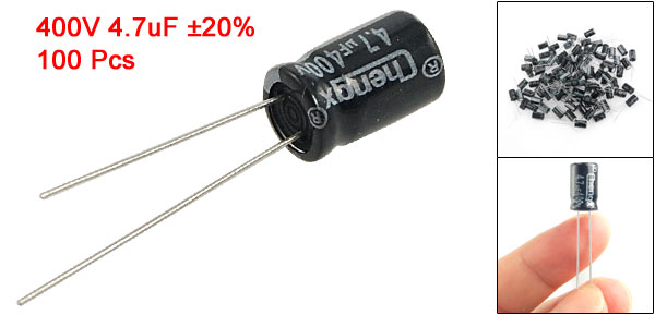 Details8x12mm 4.7uF 400V 105C Aluminum Electrolytic Capacitors(Bag of 100)  Product Name Aluminum Electrolytic Capacitor Type Radial Lead Maximum Temperature 105°C Withstand Voltage 400V Capacitance 4.7uF Capacitance Tolerance ±20% Body Size 8 x 12mm / 0.31'' x 0.47'' (D*L) Lead Spacing 3mm / 0.12'' Lead Length 27mm / 1.06'', 21mm / 0.83'' External Material Aluminum Weight 113g Color As Picture Shown Package Content 100 Pcs (±2%) x Electrolytic Capacitors