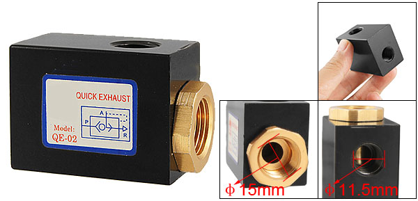 Product Name Quick Exhaust Valve Model QE-02 Gold Tone Port Diameter 15mm / 3/5" Inlet/ Outlet Ports Diameter 11.5mm / 9/20" Flow Medium Air Operating Pressure 0-0.8 kgf/cm2 Working Temperature 0 - 60 oC Total Size 52 x 36 x 28mm/ 2" x 1.4" x 1.1" (L*W*T) Main Material Aluminum Alloy Color Black & Gold Tone Net Weight 105g Package 1 x Quick Exhaust Valve - Reviews