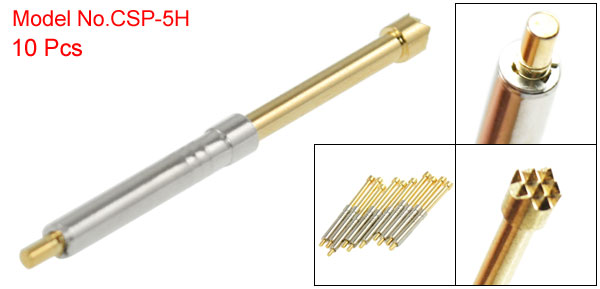 Product Name Test Probe Pin Model No. CSP-5H Tip Type Serrated Tip Tip Diameter (Approx) 3.5mm/ 9/64" Barrel Dia (Approx) 3mm/ 1/8" Overall Length (Approx) 46.2mm/ 1 13/16" Material Metal Color Gold Tone & Silver Tone Net Weigth 22g Package Content 10 Pcs x Test Probe Pin - Reviews