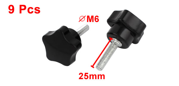 Details9 Pcs 30mm Dia Plastic Star Shaped Head M6 x 25mm Thread Clamping Screw Knob  Product Name Clamping Knob Type Screw On Head Diameter 30mm / 1.2" Thread Length 25mm / 1" Thread Diameter 6mm / 0.24" Total Length 47mm/1.9" Color Silver Tone, Black Material Metal, Plastic Weight 189g Package Content 9 x Clamping Knob