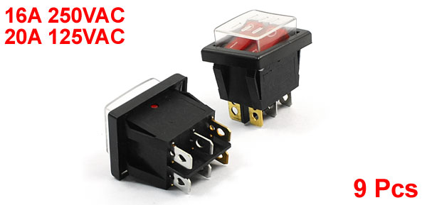 Product Name Rocker Switch Action Dual SPST Terminals 6 Pin (ON-OFF) Position Number 2 Light Color Red Rating Voltage 16A 250VAC 20A 125VAC Total Size 3.6 x 2.8 x 4cm/1.4" x 1.1" x 1.6"(L* W *T) Mounting Dimension 3 x 2.1cm/1.2" x 0.8"(L*W) Color Black, Clear, Silver Tone Material Plastic, Rubber, Metal Total Weight 156g Package Content 9 x Rocker Switch w Cover - Reviews