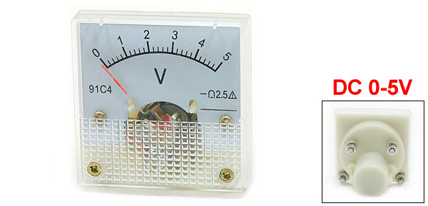 Product Name Analog Voltmeter Model No. 91C4 Measuring Voltage Range DC 0-5V Accuracy Class 2.5 Thread Dia(Approx) 3mm/ 0.12" Total Size 45 x 45 x 35mm/ 1.8" x 1.8" x 1.4"(L*W*H) Color Clear, White, Beige Material Metal, Plastic Weight 31g Package Content 1 x Analog Voltmeter