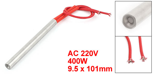 Details9.5mm x 101mm 220V 400 Watt Power Cartridge Heater Heating Element  Product Name Cartridge Heater Material Stainless Steel, PVC, Nylon Rated Voltage AC 220V Power 400W Heater Size (Approx.) 9.5 x 101mm / 0.37" x 4" (D * L ) Wire Length(Approx.) 22.5cm / 8.9" Color Silver Tone, Red Weight 35g Package Content 1 x Cartridge Heater