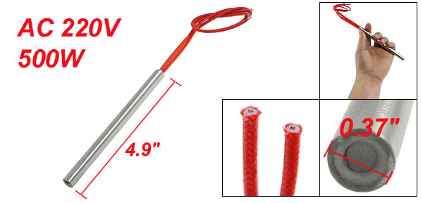 Product Name Cartridge Heater Material Stainless Steel, PVC, Nylon Rated Voltage AC 220V Power 500W Heater Size (Approx.) 9.5 x 125mm / 0.37" x 4.9" (D * L ) Wire Length (Approx.) 27.5cm / 10.8" Color As Picture Shown Weight 50g Package Content 1 x Cartridge Heater - Reviews