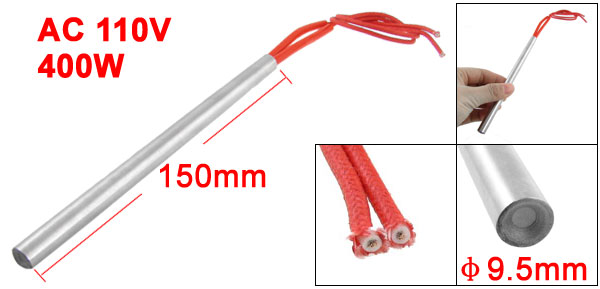 Product Name Cartridge Heater Material Stainless Steel, PVC, Nylon Rated Voltage AC 110V Power 400W Heater Size (Approx.) 9.5 x 150mm / 0.37" x 5.9" (D * L ) Wire Length (Approx.) 26.5cm / 10.4" Color Silver Tone, Red Weight 51g Package Content 1 x Cartridge Heater - Reviews