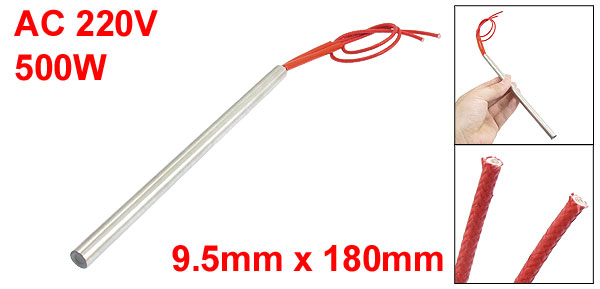 Product Name Cartridge Heater Material Stainless Steel, PVC, Nylon Rated Voltage AC 220V Power 500W Heater Size (Approx.) 9.5 x 180mm/0.37" x 7.09"(D * L) Wire Length (Approx.) 24cm / 9.5" Color Red, Silver Tone Weight 62g Package Content 1 x Cartridge Heater - Reviews
