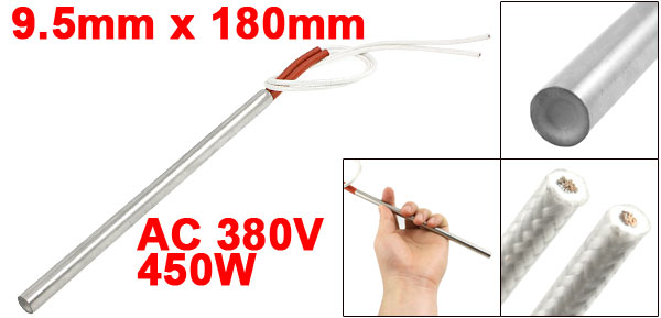 Product Name Cartridge Heater Material Stainless Steel, PVC, Nylon Rated Voltage AC 380V Power 450W Heater Size (Approx.) 9.5 x 180mm / 0.37" x 7.1" (D * L ) Wire Length (Approx.) 33cm / 13" Color Silver Tone, Red, White Weight 68g Package Content 1 x Cartridge Heater - Reviews