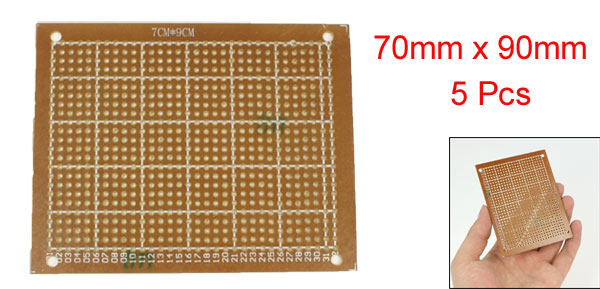 Product Name Universal PCB Board Hole Dia(Approx) 1mm / 0.039" Hole Pitch(Approx) 2.54cm / 0.1" Size(Approx) 70 x 90mm / 2.76" x 3.54"(W*L) Thickness(Approx) 1.3mm / 0.051" Material FR-4 Color Copper Tone Net Weight 47g Package Content 5 Pcs x Universal PCB Board - Reviews