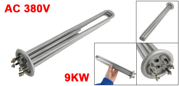 Product Name Water Heater Element Shape 3U Tube Bundle Type Main Material Stainless Steel Rated Voltage AC 380V 3 Phase Power 9KW Bar Diameter 8mm / 0.315" Silicone Ring Dia. 60mm/ 2.4" Overall Size(Approx.) 35 x 6.3cm/ 13.8" x 2.5"(L*Max.D) Thread Diameter 3.9mm / 0.15" Color Silver Tone Weight 559g Package Content 1 x Water Heater Element