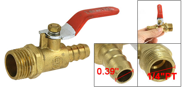 Product Name Ball Valve Material Brass Color Gold Tone, Red Inner Valve Hole Dia 7mm Thread Dia. 1/4"PT Hose Barb Dia. 9mm Level Handle Size 45 x 10mm/ 1.77" x 0.39"(L*W) Overall Size 55 x 15 x 30mm/ 2.2'' x 0.6'' x 1.2'' (L*W*H) Net Weight 84g Package Contents 1 x Ball Valve - Reviews