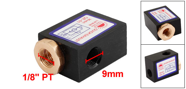 Product Name Quick Exhaust Valve Model QE-01 Female Thread Diameter 9mm Ports Size 1/8" PT Working Medium Air Operating Pressure 0 - 0.8MPa Working Temperature 0 - 60 oC Total Size 39 x 27 x 18mm/ 1.5" x 1.1" x 0.71" (L*W*T) Main Material Aluminum Alloy Color Black, Gold Tone Weight 44g Package 1 x Quick Exhaust Valve - Reviews
