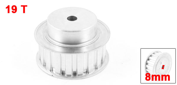 Product Name Timing Pulley Type L Number of Tooth 19 Pitch 9mm/ 7/20'' Bore Diameter 8mm/ 3/10'' Fit Belt Width 21mm/ 0.83'' Overall Size 62 x 38mm/ 2.4'' x 1.5''(D*H) Material Alloy Color Silver Tone Weight 223g Package Content 1 x Timing Pulley - Reviews