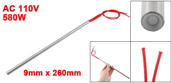 Product Name Cartridge Heater Material Stainless Steel, PVC, Nylon Rated Voltage AC 110V Power 580W Heater Size (Approx.) 9 x 260mm/0.35'' x 10.2'' (D * L) Wire Length (Approx.) 285mm / 11.2" Color Red, Silver Tone Weight 73g Package Content 1 x Cartridge Heater - Reviews