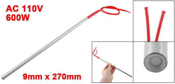 Product Name Cartridge Heater Material Stainless Steel, PVC, Nylon Rated Voltage AC 110V Power 600W Heater Size (Approx.) 9 x 270mm/0.35'' x 10.6'' (D * L) Wire Length (Approx.) 290mm / 11.4" Color Red, Silver Tone Weight 76g Package Content 1 x Cartridge Heater - Reviews