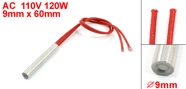 Product Name Cartridge Heater Material Stainless Steel, PVC, Nylon Rated Voltage AC 110V Power 120W Heater Size (Approx.) 9 x 60mm / 0.35" x 2.4" (D * L) Wire Length (Approx.) 26cm / 10.2" Color Red, Silver Tone