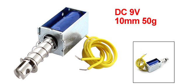 Product Name DC Solenoid Electromagnet Coil Voltage DC 9V Action Form Pull Type Rated Stroke & Force 10mm, 50g Connection Rate 10% Body Size 30 x 14 x 16mm / 1.2" x 0.55" x 0.63" (L*W*H) Cable Length 25cm / 10" Plunger Dia. 7mm / 0.28" Plunger Connect Hole Dia. 2.5mm/0.1" Material Metal, Electronic Parts Net Weight 36g Package Content 1 x DC Solenoid Electromagnet - Reviews