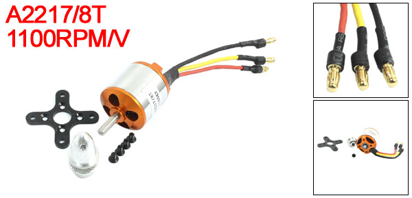 Product Name Brushless Motor Model A2217/8T Recommended Propeller GWS1060HD Shaft Size 4 x 14mm/0.16" x 0.55"(D*L) Rotating Speed 1100RPM/V Non Load Voltage 10.5V 15.8A Connector Type 3 Banana Plug Total Size 48 x 28mm/1.9" x 1.1"(L*D) Wire Length 75mm/3" Materials Plastic, Copper, Metal Main Color Copper Tone, Silver Tone Net Weigth 97g Package Content 1 x Brushless Motor