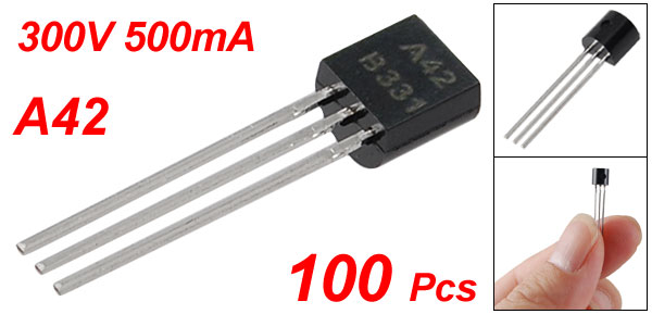 Product Name NPN Transistor Model A42 Quantity 100 ± 2% Pcs Collector Base Voltage 300V Collector Emitter Voltage 300V Emitter Base Voltage 5V Collector Current(Continuous) 500mA Collector Power Dissipation 0.625W Pin Size 14 x 0.5mm/ 0.551" x 0.019" ( L* D) Body Dimension 4 x 3 x 4mm/ 0.16" x 0.12" x 0.16" (L*W*T) Pitch 1.5mm/0.059" Main Color Black Weight 22g Package Content 100 ± 2% x NPN Transistors - Reviews