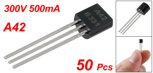 Product Name NPN Transistor Model A42 Quantity 50 ± 2% Pcs Collector Base Voltage 300V Collector Emitter Voltage 300V Emitter Base Voltage 5V Collector Current(Continuous) 500mA Collector Power Dissipation 0.625W Pin Size 14 x 0.5mm/ 0.551" x 0.019" ( L* D) Body Dimension 4 x 3 x 4mm/ 0.16" x 0.12" x 0.16" (L*W*T) Pitch 1.5mm/0.059" Main Color Black Weight 11g Package Content 50 ± 2% x NPN Transistors - Reviews
