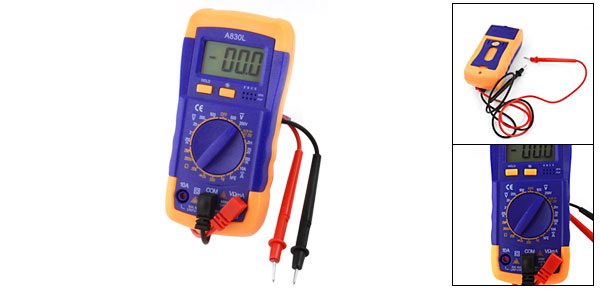 Product Name Digital Multimeter Model A830L DC Current 2mA/20mA/200mA/20A AC Voltage 200V/500V DC Voltage 200mV/2V/20V/200V/500V Resistance 200/2K/20k/200K/20M Ohm Working Temperature -20C to 1000C Power Supply 1 x 9V Batteries(Not Included Here) Multimeter Size 14.5 x 6.5 x 3.2cm/ 5.7" x 2.6" x 1.2"(L*W*T) Testing Lead Length 40cm/15.8" Mateiral Plastic, Electronic Parts Main Color Blue, Orange Total Weight 215g Package Content 1 x Digital Multimeter
