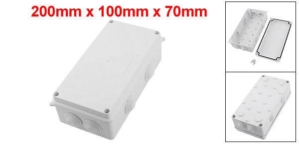 Product Name Waterproof Junction Box Total Size 200 x 100 x 70mm/ 7.9" x 3.9" x 2.8"(L*W*H) Internal Size 200 x 100 x 60mm/ 7.9" x 3.9" x 2.4"(L*W*H) Cable Entries Number 8 Mounted Type Surface Mounting Hole Diameter 26mm/ 1" Waterproof Rating IP65 Material ABS, Rubber Color White Net Weight 267g Package 1 x Waterproof Junction Box - Reviews