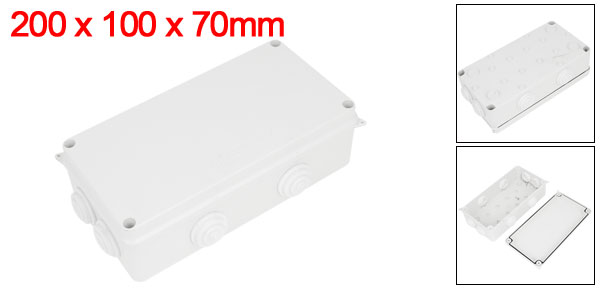 Product Name Waterproof Junction Box Total Size 200 x 100 x 70mm/ 7.9" x 3.9" x 2.8"(L*W*H) Cable Entries Number 8 Mounted Type Surface Mounted Hole Diameter 28mm/ 1.1" Waterproof Rating IP65 Material ABS, Rubber Color White Net Weight 259 Package 1 x Waterproof Junction Box - Reviews