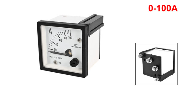 Product Name AC Analog Ammeter Type 99T1 Measuring Range 0-100A Current Transformer 100/5A Mechanical Resistance 30m/s² per min. Accuracy 2.5 Magnetic Influence +2.5% at 5 Oe Insulation Force 1 minutes at 2000V, 50Hz AC Operating Temperature Range -20~+40C Mounting Type Vertical Thread Dia. 4mm/0.16"