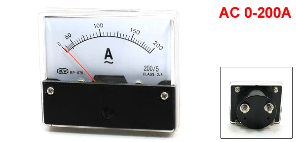 Product Name Analog Ammeter Model BP-670 Measuring Current Range AC 0-200A Accuracy Class 2.5 Total Size 71 x 61 x 48mm / 2.8" x 2.4" x 1.9"(L*W*T) Screw Thread Diameter 5mm/0.2", 3mm/ 0.12"