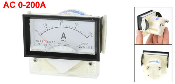 Product Name Analog Ammeter Measuring Current Range AC 0-200A Accuracy Class 2.5 I1/I2 200/5A Meter Face Size(Approx) 7 x 5.8 x 5.3cm / 2.8" x 2.3" x 2.1" (L*W*T) Screw Thread Diameter 4mm / 0.16"