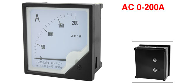 Product Name Analog Ammeter Model 42L6 Measuring Current Range AC 0-200A Current Transformer Type 200/5(Not Included There) Accuracy Class 1.5 Screw Dia 5mm/0.2" Screw Center Distance 34mm/1.3" Panel Mounting Size 112 x 112mm/4.3" x 4.3"(L*W) Total Size 120 x 120 x 90mm/4.7" x 4.7" x 3"(L*W*H) Color Clear, Black Net Weight 281g Total Weight 324g Package Content 1 x Analog Ammeter