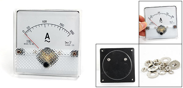Product Name Analog Ammeter Model YS-80 Measuring Current Range AC 0-200A Accuracy Class 2.5 Meter Face Size(Approx.) 8.2 x 8.2 x 1.3cm / 3.2" x 3.2" x 0.5" (L*W*H) Thread Size 0.2 x 1cm / 0.08" x 0.39" (D*L) 0.4 x 1.4cm / 0.16" x 0.55" (D*L) Total Thickness 5cm / 2" Material Plastic, Electronic Components Color White, Black Net Weight 111g Package Content 1 x Analog Ammeter Installation kits - Reviews
