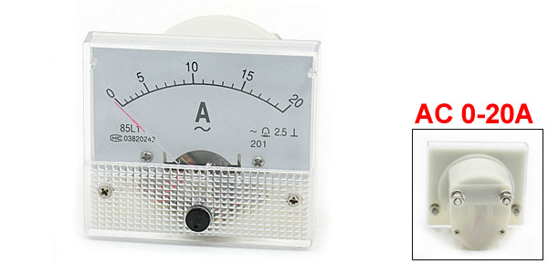 DetailsAC 0-20A Current Range Analog Panel Meter Ammeter 85L1  Product Name Analog Ammeter Model 85L1 Measuring Current Range AC 0-20A Accuracy Class 2.5 Meter Face Size(Approx.) 6.4 x 5.6 x 1.2cm / 2.5" x 2.2" x 0.47" (L*W*H) Total Thickness 6cm / 2.4" Mounting Thread Dia. 4mm/ 0.16", 3mm/ 0.12" Material Plastic, Electronic Components Color White, Beige Weight 110g Package Content 1 x Analog Ammeter