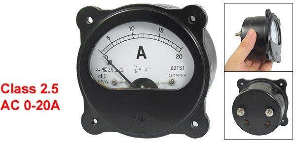 Product Name Analog Ammeter Model 62T51-A Measuring Current Range AC 0-20A Accuracy Class 2.5 Meter Face Size(Approx) 85 x 85 x 6mm / 3.3" x 3.3" x 0.24"(L*W*T) Screw Thread Diameter 4.8mm/0.2"