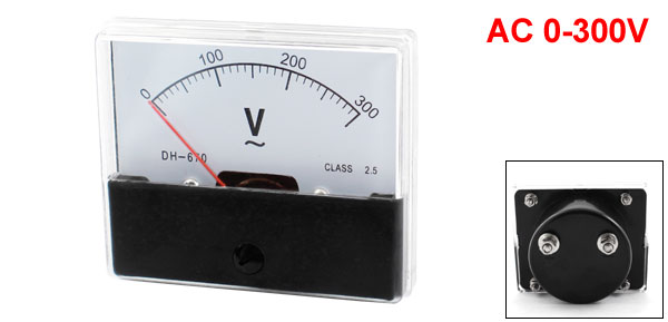 Product Name Analog Voltmeter Model DH-672 Measuring Current Range AC 0-300V Accuracy 2.5 Panel Size(Approx) 72 x 61 x 12mm/2.8" x 2.4" x 0.47"(L*W*T) Overall Depth(Not Included Screw ) 36m/ 1.4" Round Dia 51mm/2" Color Black, White, Clear Net Weight 61g Package Content 1 x Analog Voltmeter